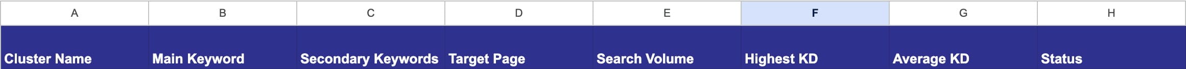 The goal here is to group all of your target keywords together into clusters, then optimize existing pages or create new content in order to rank for those keywords. Let’s explain each of the columns in our keyword map: